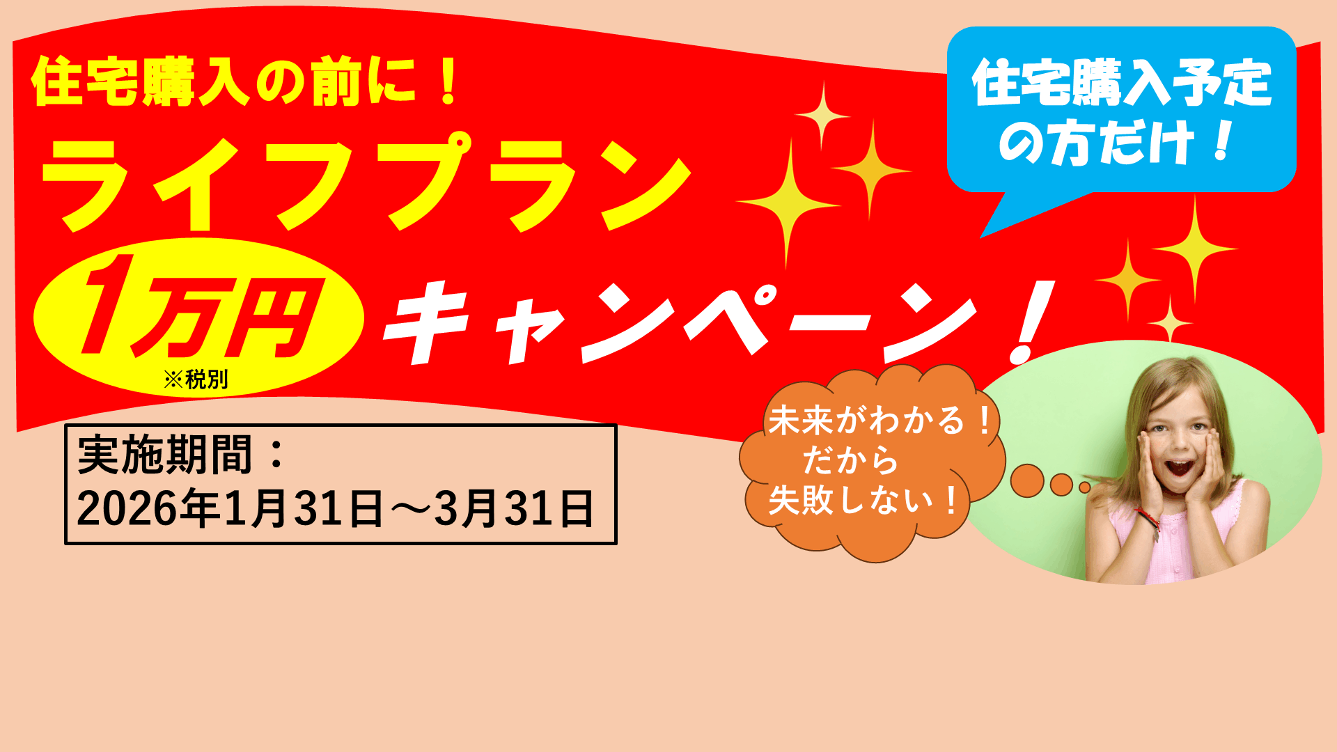 住宅取得とライフ(マネー)プランは切っても切れない関係!家計や大切にしたいライフイベントもご家庭ごとに大きく異なります。 弊社のライフプランニングは、ご家庭ごとに叶えたいこと・守りたいこと・ゆずれないこと・万が一に備えた保険見直しなどを加えて具体的・高精度のプランニングをしております。 だから住宅ローンの借りすぎ防止になる!教育費・老後資金にも不安なし! |